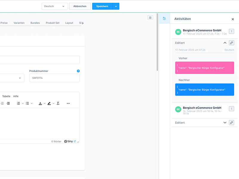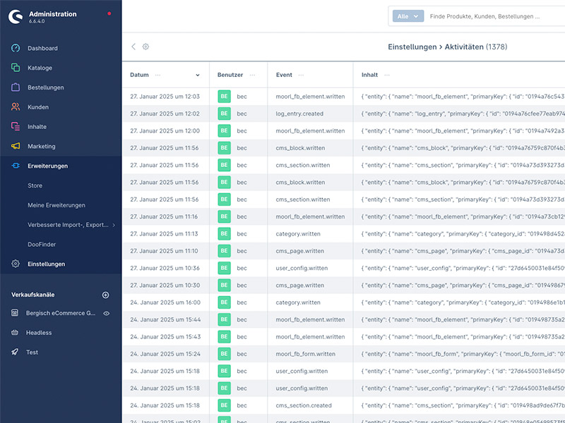 Die Erweiterung protokolliert alle Änderungen in Shopware, sodass nachvollziehbar ist, wer wann welche Änderungen im System gemacht hat.
